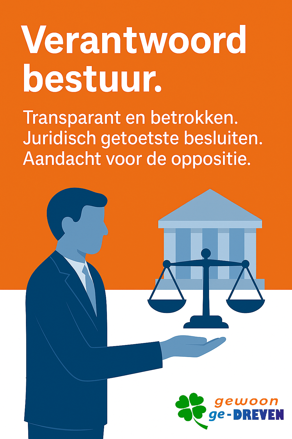 De mensen van gewoon ge-DREVEN vinden dat besturen en communiceren beter kan. Het is belangrijk om als bestuurder naar de burger te luisteren en daarom gaan wij graag met u in gesprek. Wij willen dichtbij de burger staan om echt te weten wat er in de gemeente speelt.
